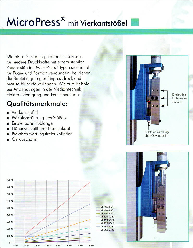 MicroPress mit Vierkantstößel Pneumatik TischPresse direktwirkend mit 30 N bis 750 N Druckkraft serienmäßig mit Hubfeineinstellung Ausladung 63 mm, Hub max. 60 mm ArbeitsHöhe 43 - 208 mm Technische Daten siehe unten  |