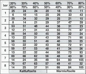 Die folgende Tabelle ist basierend auf einer einströmenden Lufttemperatur von 294 K.Wenn die absolute Temperatur der einströmenden Luft doppelt ist, sind die Resultate von Abfall / Anstieg der Temperatur